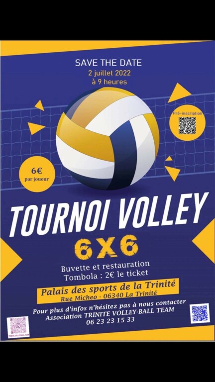 Le club de volley de la Trinité organise un tournoi 6x6. 6 euros par joueur. Buvette et restauration Palais des sports de la Trinité - Rue Micheo - 06340 LA TRINITE